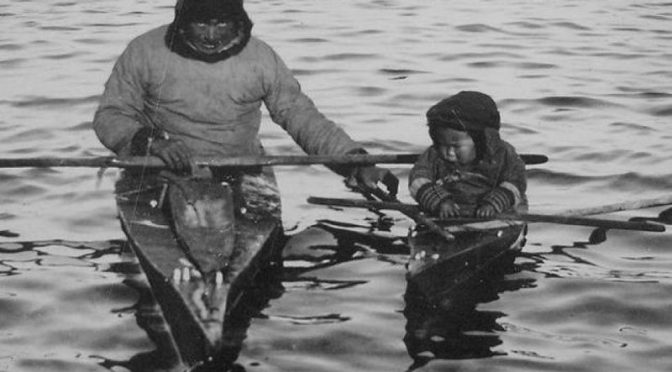 Эскимосы – удивительный морской народ, который обитал по всей Арктике. Они создали замечательную лодку – каяк. Это одноместная каркасная конструкция, обтянутая шкурами, у которой верхнее полотно плотно затягивается вокруг пояса. Двойное весло имеет лопасти, расположенные в разных плоскостях: когда одна лопасть уходит в воду, вторая поворачивается горизонтально, чтобы не подставляться ветру.