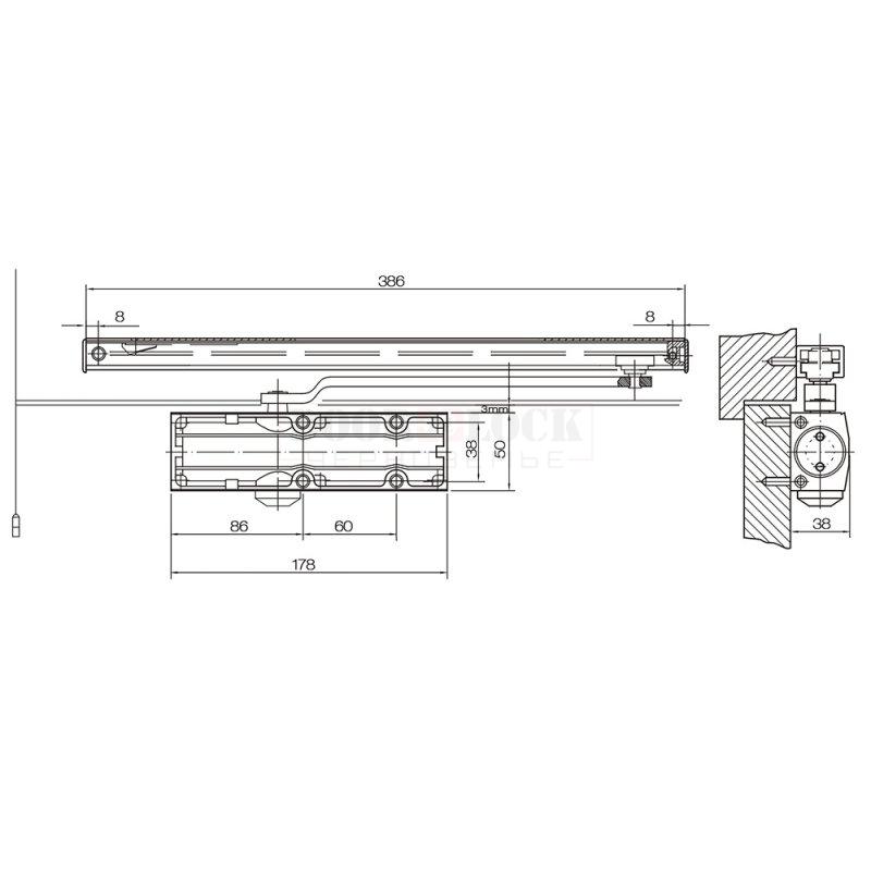 - Накладной доводчик, механизм которого включает в себя зубчатый привод.